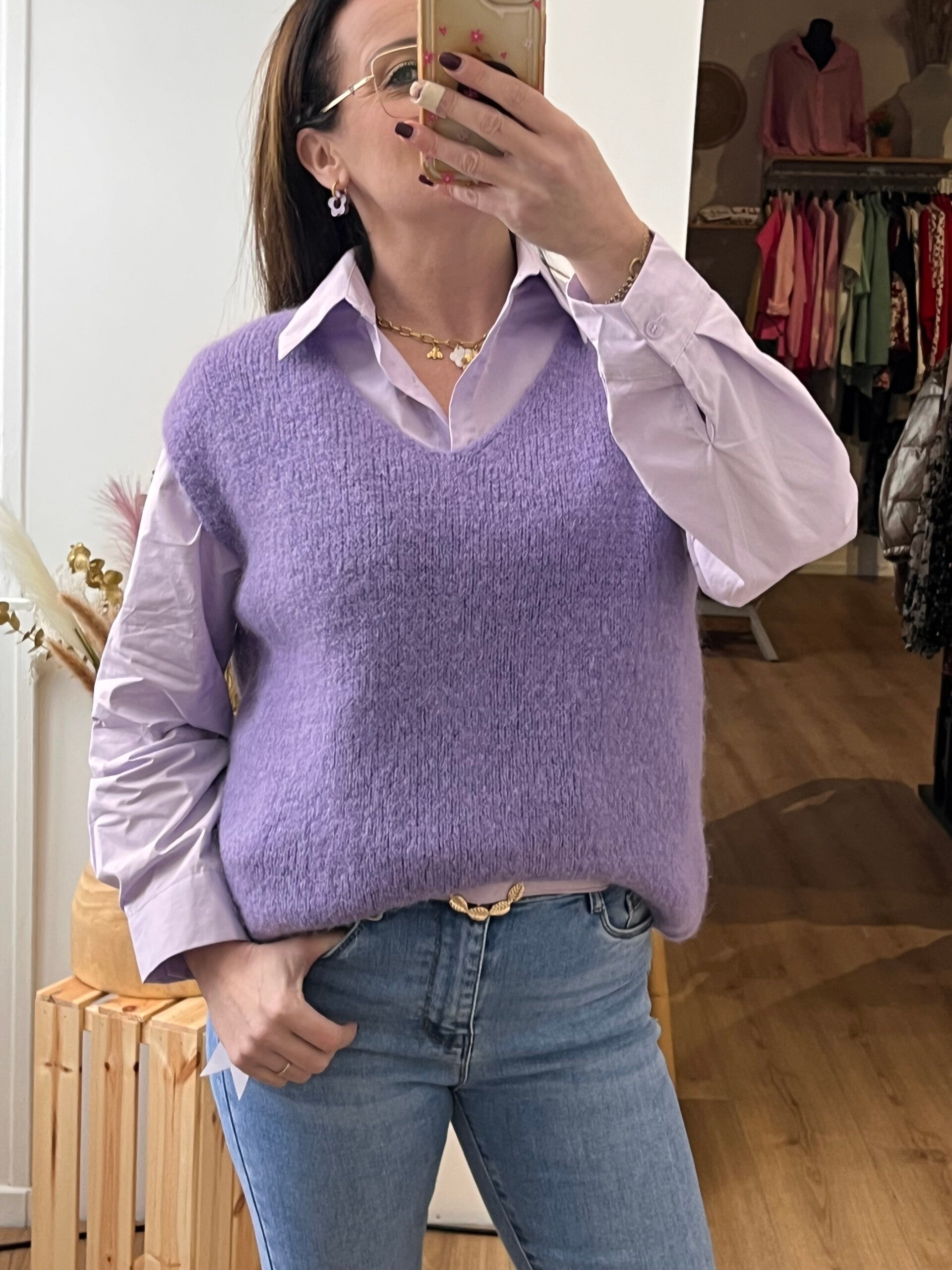 Chemise couleur LILA avec ses magnifiques boutons doré pour un look extra